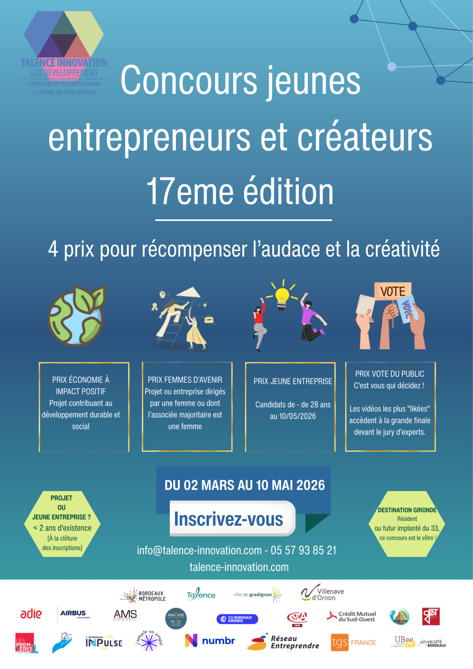Le concours est ouvert à tout porteur de projet ou créateur dont l’entreprise a moins de 2 ans au 10 mai 2026. Vous devez résider en Gironde, y avoir implanté votre activité ou vous engager à le faire.